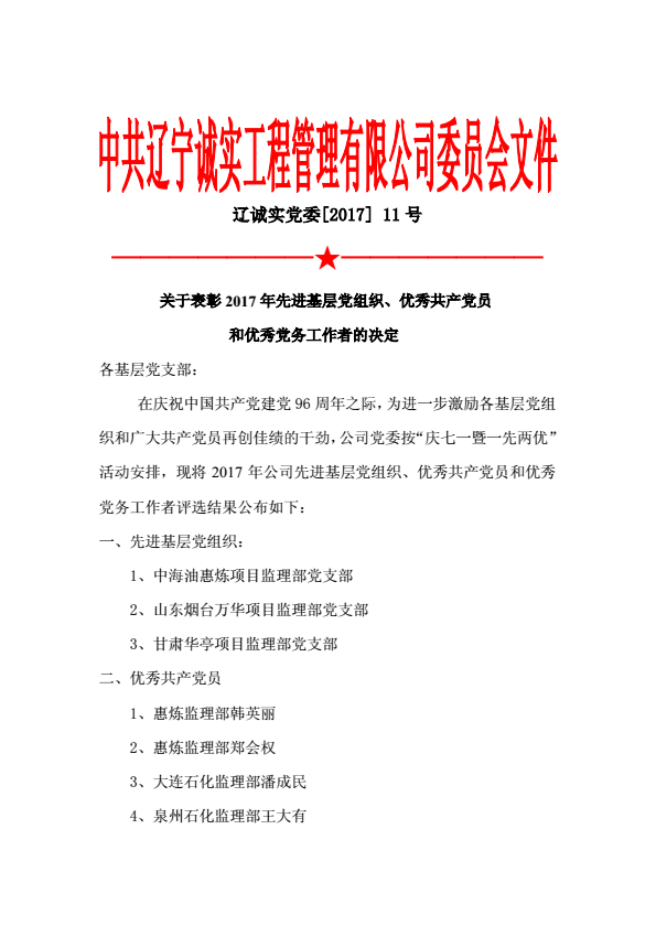 為慶祝中國(guó)共產(chǎn)黨建黨96周年,公司黨委于2017年6月30日下午在公司一樓會(huì)議室召開了慶祝建黨96周年暨“一優(yōu)兩先”表彰視頻大會(huì)。公司機(jī)關(guān)、撫順各項(xiàng)目監(jiān)理部及在撫的黨員同志在主會(huì)場(chǎng)參加了大會(huì),中海油惠州項(xiàng)目監(jiān)理部黨支部、甘肅華亭項(xiàng)目監(jiān)理部黨支部、寧夏石化項(xiàng)目監(jiān)理部黨支部、中化泉州項(xiàng)目監(jiān)理部黨支部、廣西石化項(xiàng)目監(jiān)理部黨支部、蘭州石化項(xiàng)目監(jiān)理部黨支部、內(nèi)蒙古君正項(xiàng)目監(jiān)理部黨支部、神華寧煤項(xiàng)目監(jiān)理部黨支部、煙臺(tái)萬華項(xiàng)目監(jiān)理部黨支部設(shè)立視頻分會(huì)場(chǎng)。黨委委員馬駿主持了視頻大會(huì)。首先,公司黨委副書記馮玉琢同志宣讀了“一優(yōu)兩先”表彰決定。接著,黨委書記孫學(xué)良結(jié)合公司實(shí)際做了慶祝建黨96周年的講話。最后全體黨員重溫的入黨誓詞,進(jìn)行入黨宣誓。