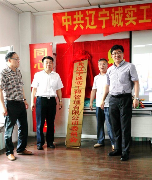 中共撫順市委組織部領導李勁夫(右二)、中共新撫區委副書記羅玉生(左二)、新撫區委常委組織部長 隋淑貴(右一)、遼寧誠實工程管理有限公司董事長趙華(左一)為中共遼寧誠實工程管理有限公司委員會揭牌